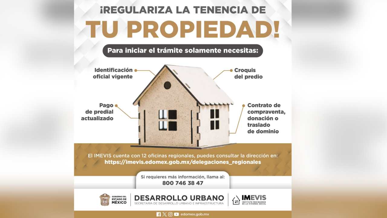 Con el objetivo de promover la importancia de obtener un documento legal que garantice tu propiedad, el Gobierno del Estado de México (Edomex). pone a tu disposición las 12 oficinas regionales del Imevis para que regularices la tenencia de tu propiedad.