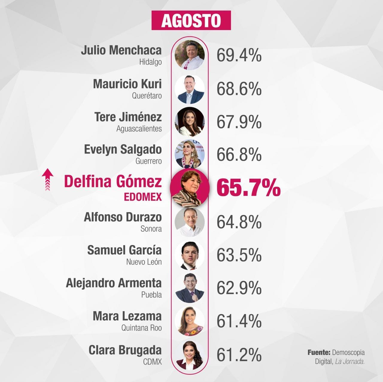 El más reciente estudio de Demoscopia Digital (agosto 2025) reveló que la gobernadora del Estado de México, Delfina Gómez Álvarez, alcanzó un histórico 65.7% de aprobación ciudadana, ubicándose entre los cinco mejores lugares a nivel nacional.