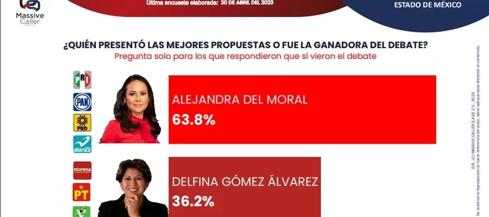 De entre los encuestados, solo el 36.2 por ciento consideró que Delfina Gómez, la candidata de Movimiento Regeneración Nacional (MORENA), Partido del Trabajo (PT) y Partido Verde Ecologista de México (PVEM), ganó o tuvo las mejores propuestas ante la representante de la coalición.