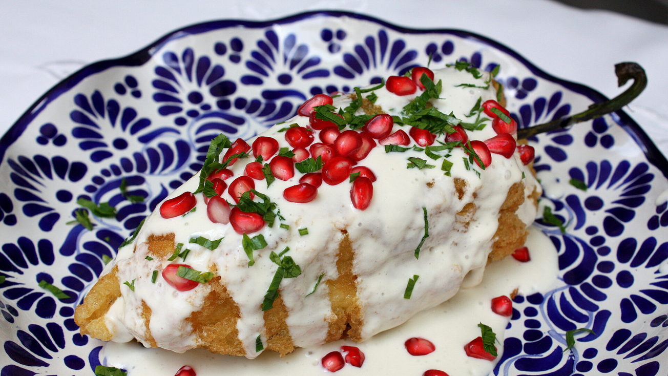 Su temporada coincide con la cosecha de ingredientes clave como la nuez de Castilla, la granada, manzana panochera, durazno criollo y pera lechera. Es un platillo originario del convento de Santa Mónica en Puebla y nació para celebrar la independencia de México.