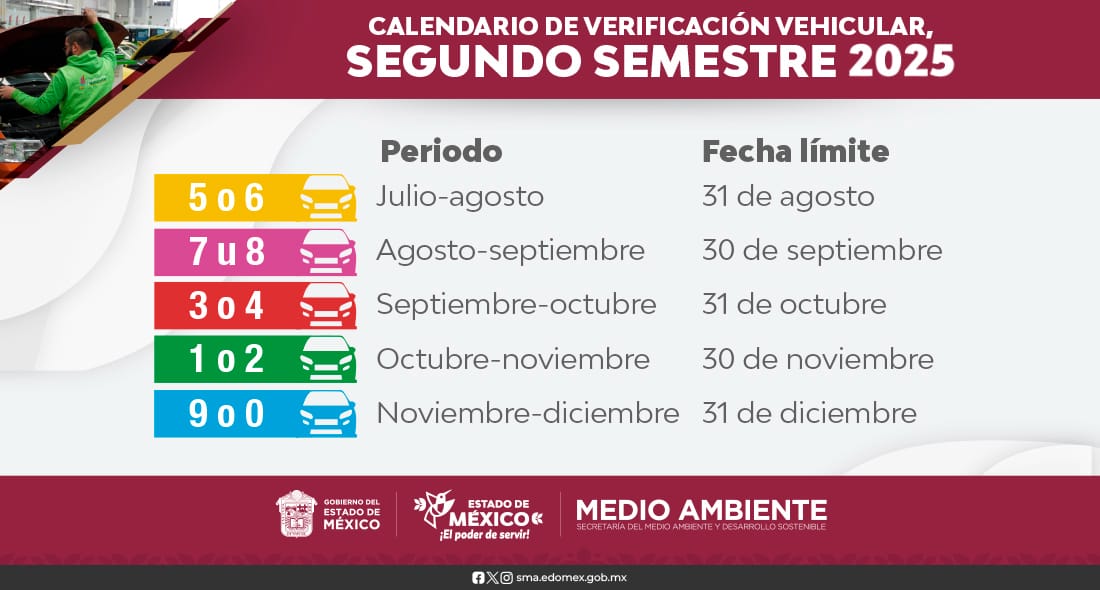 Según el calendario de verificación del segundo semestre de 2025 en Edomex, se dio a conocer a través de la Gaceta Oficial de la entidad durante los últimos días de 2024, y marca que el engomado amarillo, deberá verificar en julio-agosto, mientras que el rosa de agosto-septiembre.